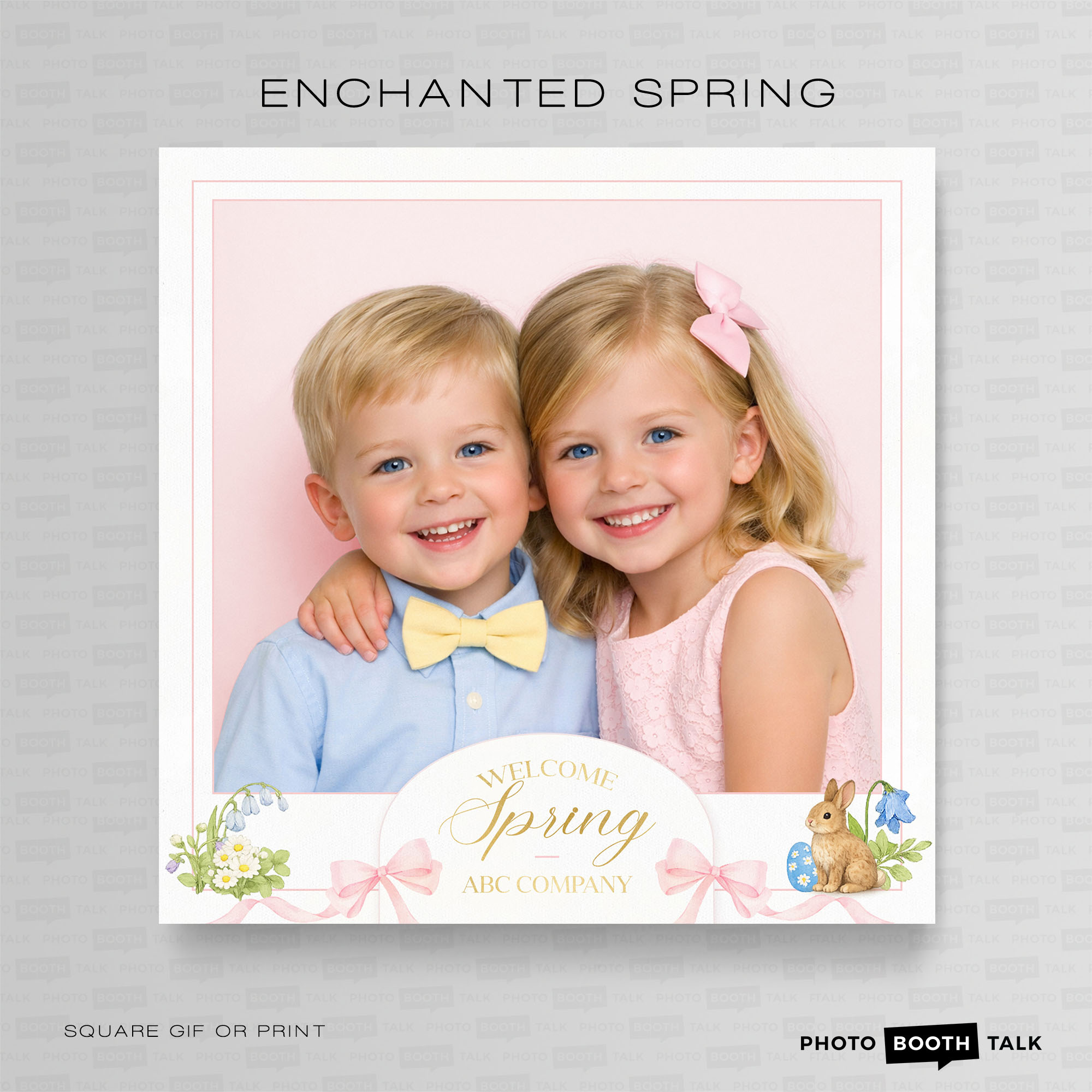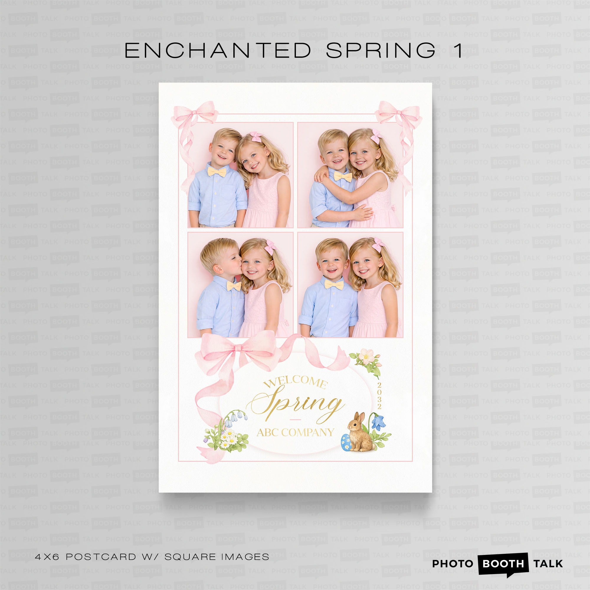 Elevate your spring events with this luxury Enchanted Spring photo booth template collection, designed with soft pastel tones, watercolor florals, blush pink bows, and elegant gold accents.