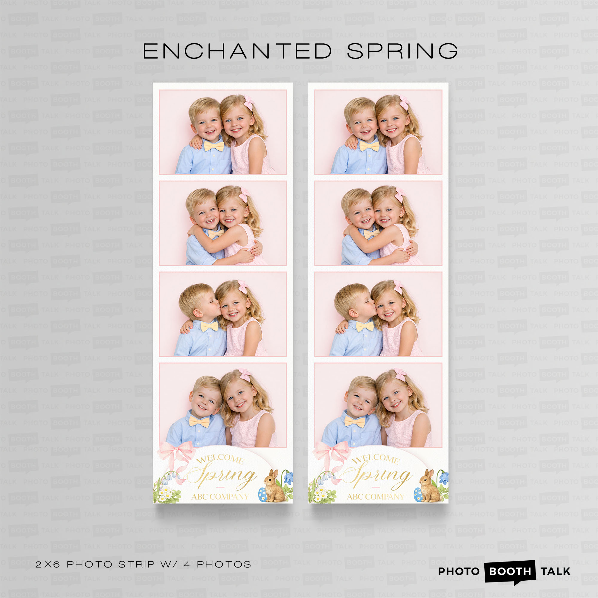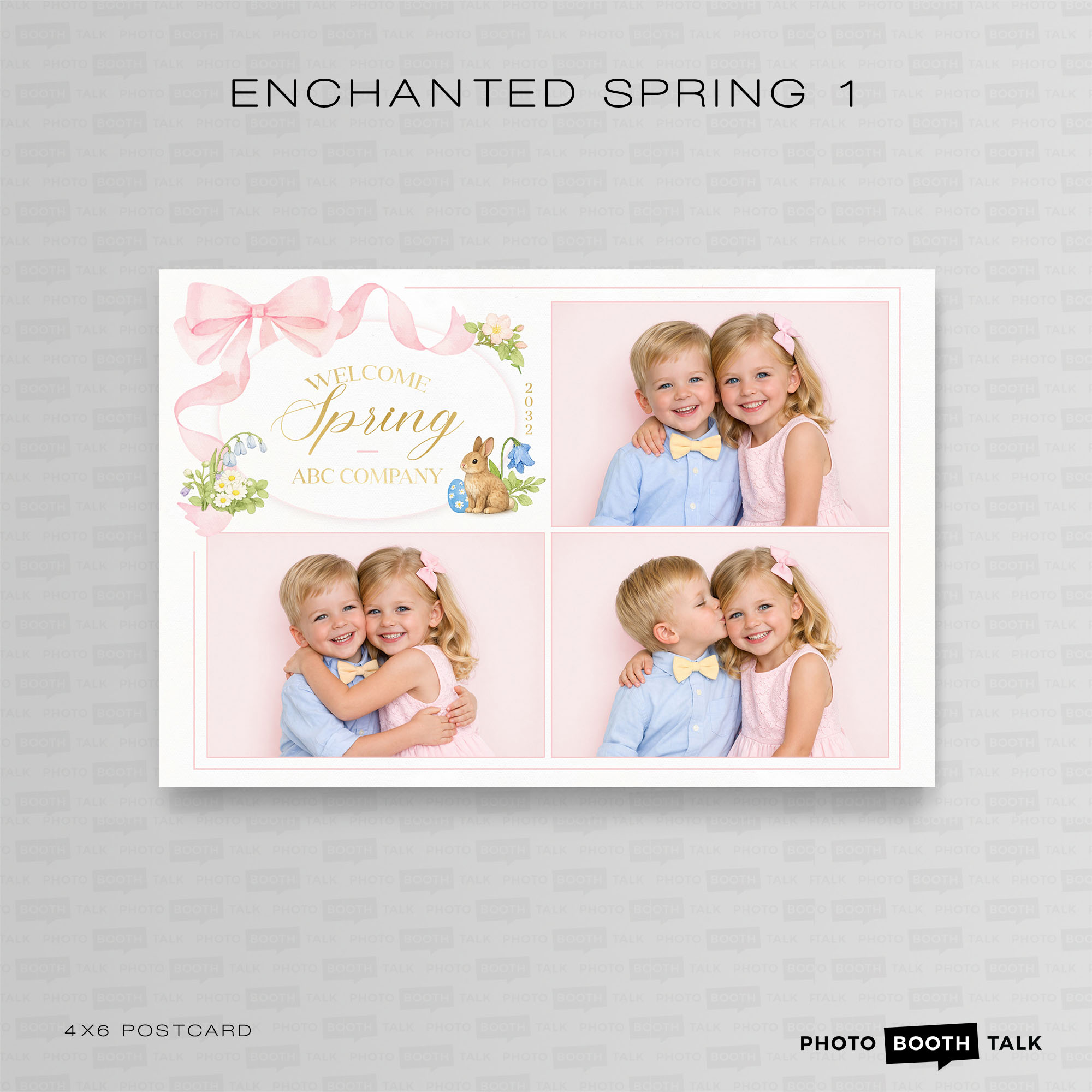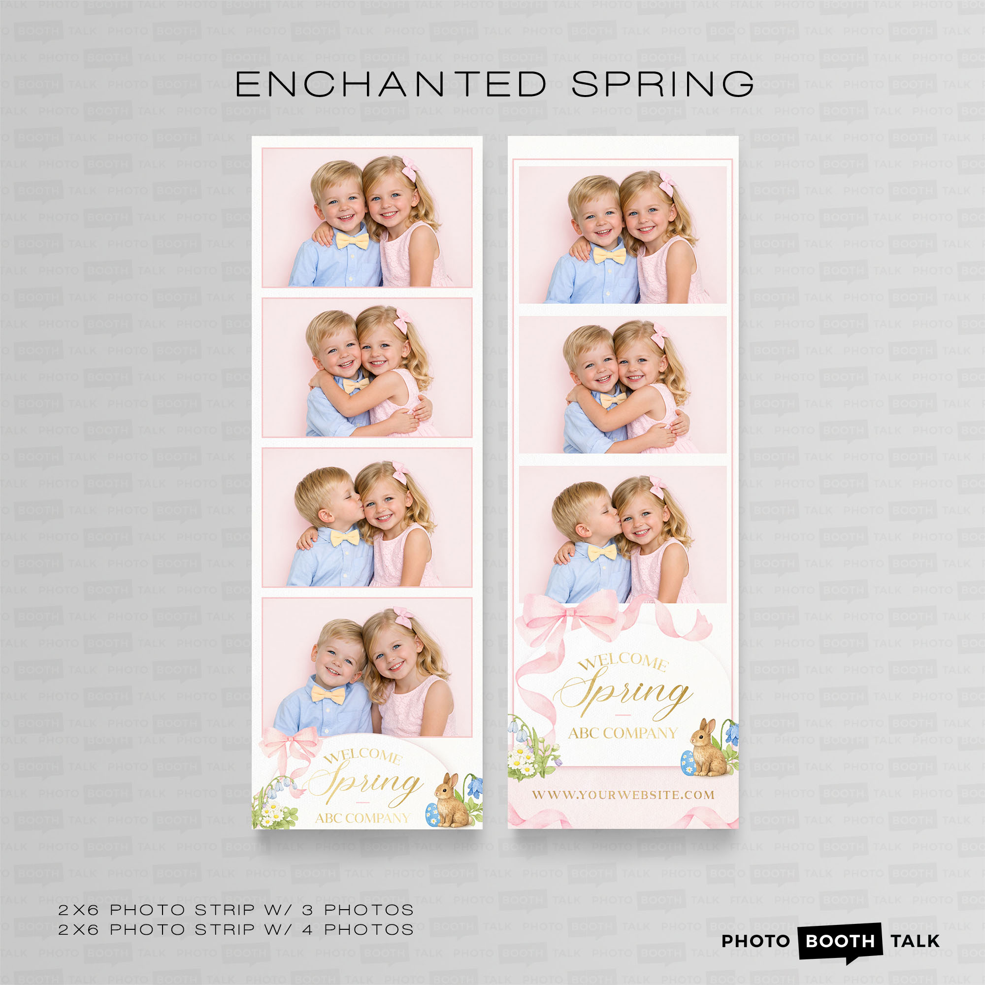 Elevate your spring events with this luxury Enchanted Spring photo booth template collection, designed with soft pastel tones, watercolor florals, blush pink bows, and elegant gold accents.