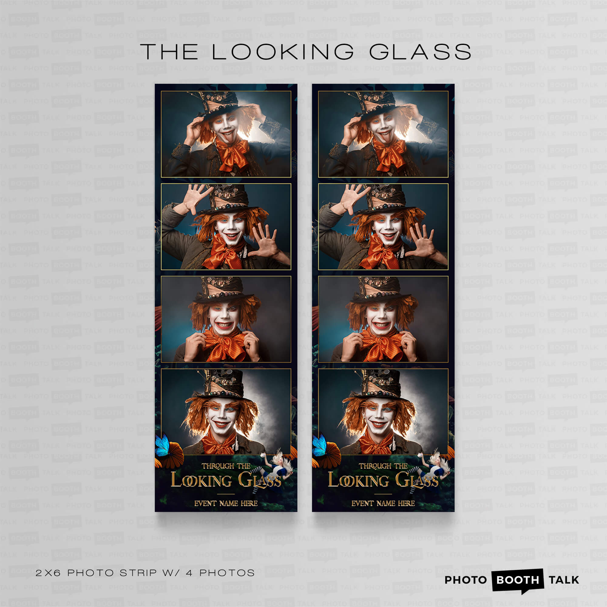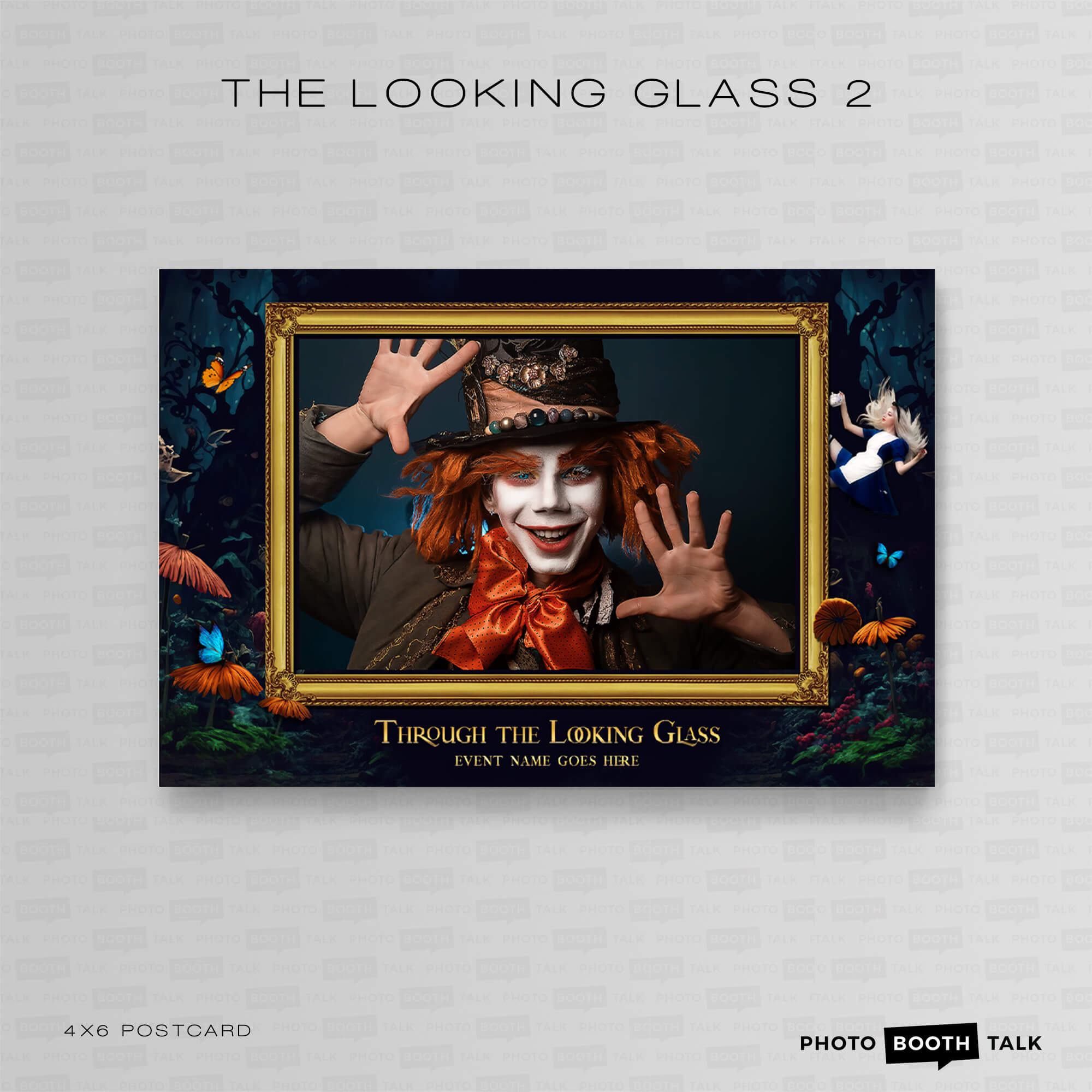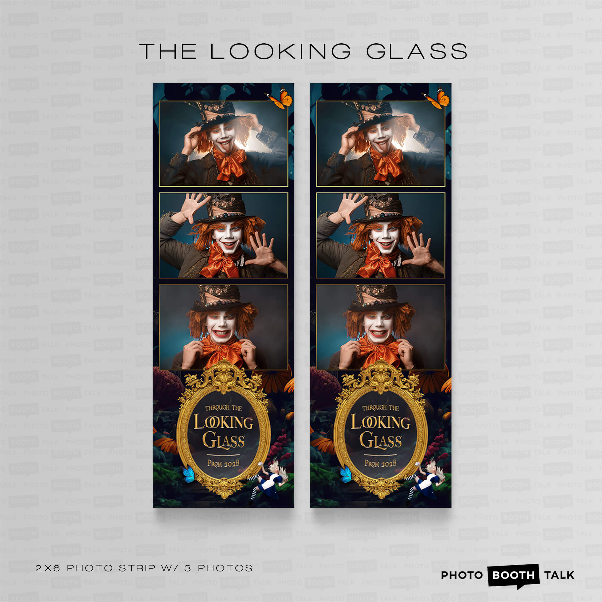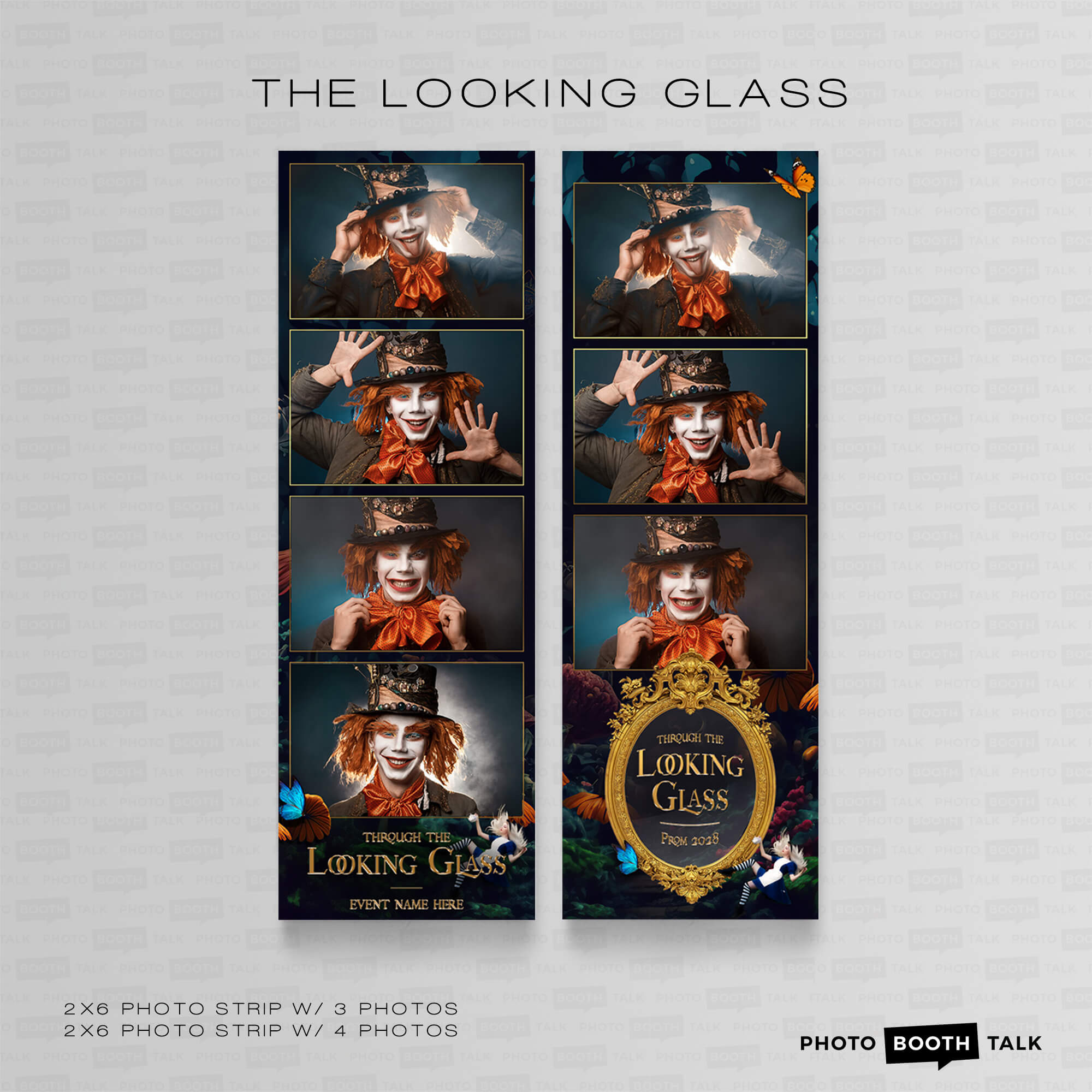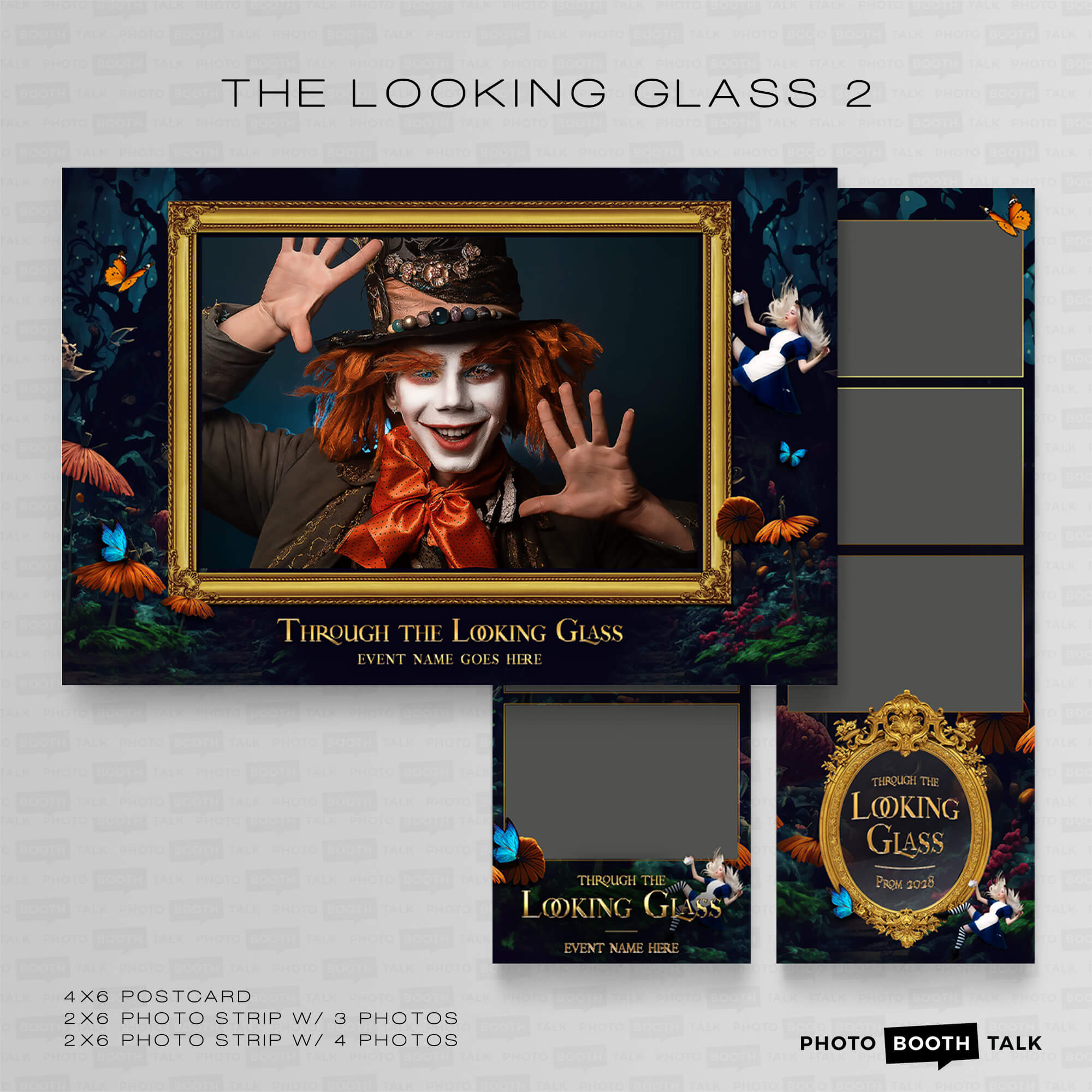 The Looking Glass - Alice in Wonderland themed Photo Booth Templates, featuring ornate gold mirrors, a falling Alice and life-sized flowers, perfect for adult theme parties, school dances and proms.