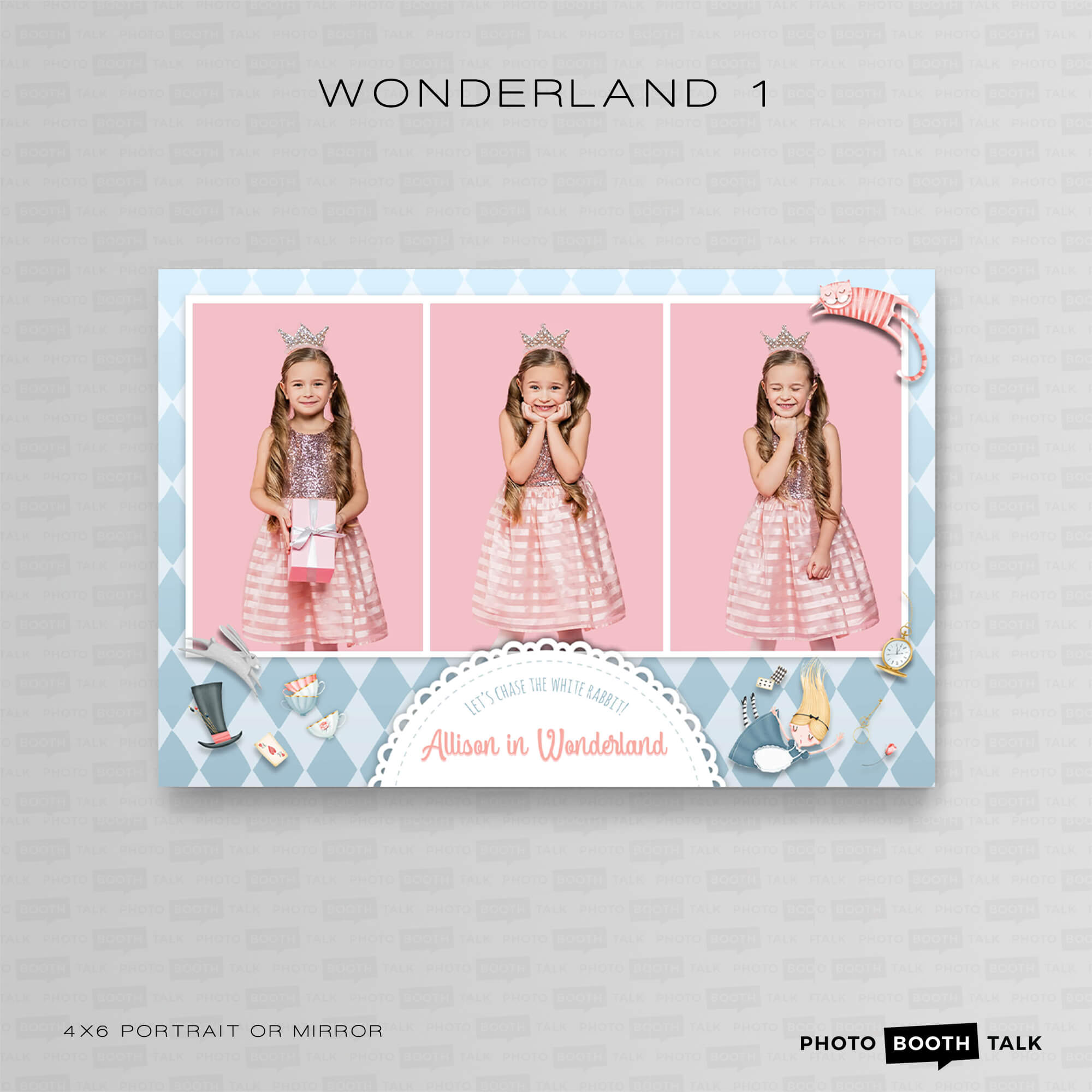 Wonderland - Alice in Wonderland themed Photo Booth Templates, featuring a falling Alice, pink flamingo, Cheshire Cat, Rabbit, Mad Hatter's top hat and tea cups.